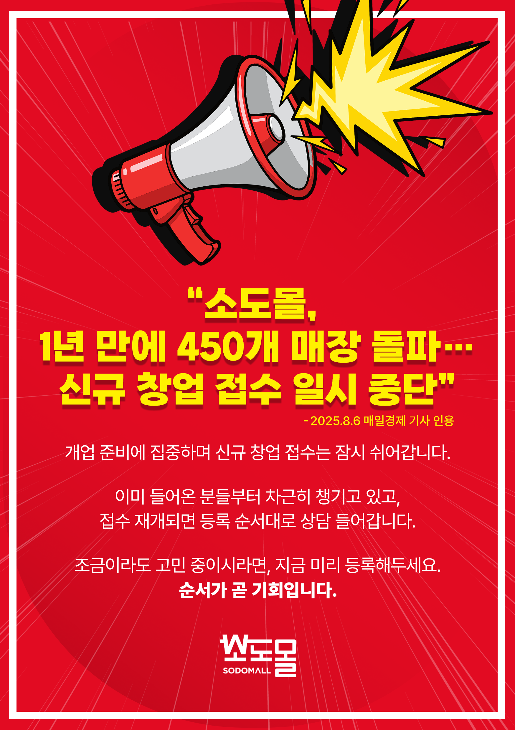 소도몰 창업을 위해 필요한 상세사항은 아래 상담 신청을 통해 전문가와 상담 시 상세히 안내드립니다.